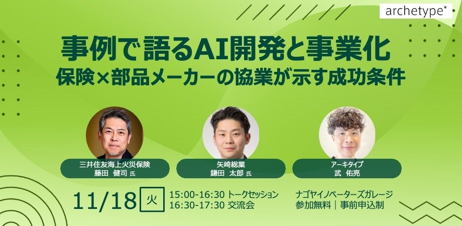 企業の新規事業創出・成長支援を行うアーキタイプ株式会社(本社:東京都港区、代表者:菅野龍彦、以下「アーキタイプ」)は、三井住友海上火災保険株式会社(以下「三井住友海上」)および矢崎総業株式会社(以下「矢崎総業」)の実務者を迎え、2社共創事業であるAI安全運転ソリューション「TRUE SAFE」を題材に、AI開発・新規事業創出の舞台裏を共有するトークイベントを、11月18日(火)にナゴヤイノベーターズガレージで開催いたします。