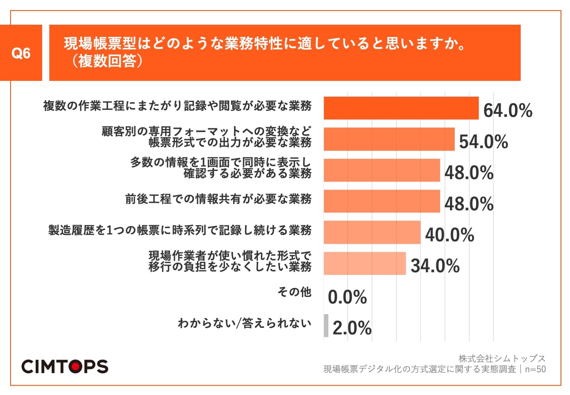 Q4で「十分理解していた」「ある程度理解していた」かつQ5で「現場帳票型」「両方式を併用している」と回答した方に、「Q6.現場帳票型はどのような業務特性に適していると思いますか。(複数回答)」(n=50)と質問したところ、「複数の作業工程にまたがり記録や閲覧が必要な業務」が64.0%、「顧客別の専用フォーマットへの変換など帳票形式での出力が必要な業務」が54.0%、「多数の情報を1画面で同時に表示し確認する必要がある業務」が48.0%という回答となりました。