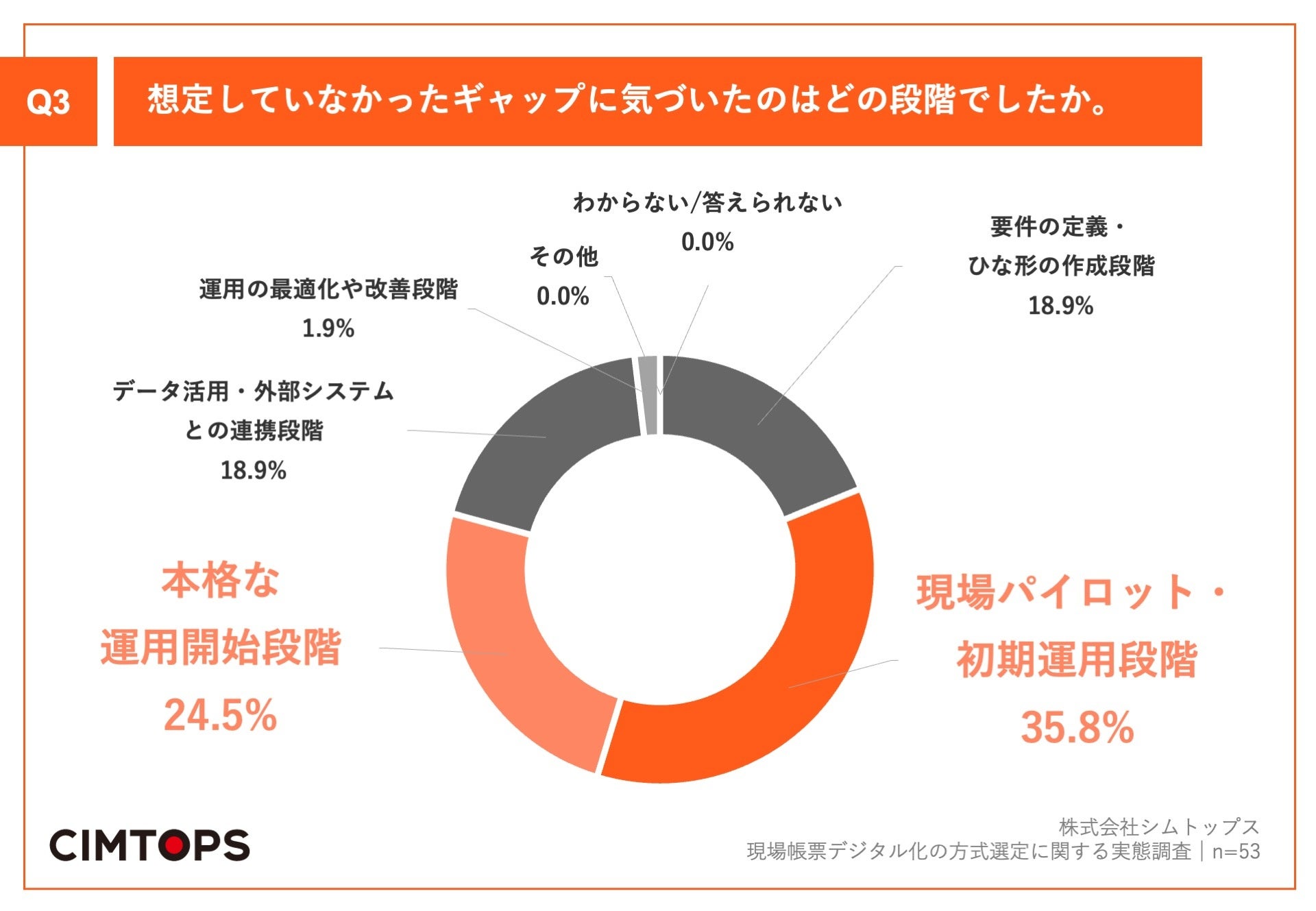 Q2で「全く想定していなかった」「あまり想定していなかった」と回答した方に、「Q3.想定していなかったギャップに気づいたのはどの段階でしたか。」(n=53)と質問したところ、「要件の定義・ひな形の作成段階」が18.9%、「現場パイロット・初期運用段階」が35.8%という回答となりました。
