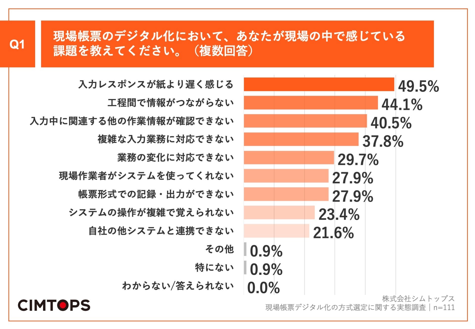 「Q1.現場帳票のデジタル化において、あなたが現場の中で感じている課題を教えてください。(複数回答)」(n=111)と質問したところ、「入力レスポンスが紙より遅く感じる」が49.5%、「工程間で情報がつながらない」が44.1%、「入力中に関連する他の作業情報が確認できない」が40.5%という回答となりました。
