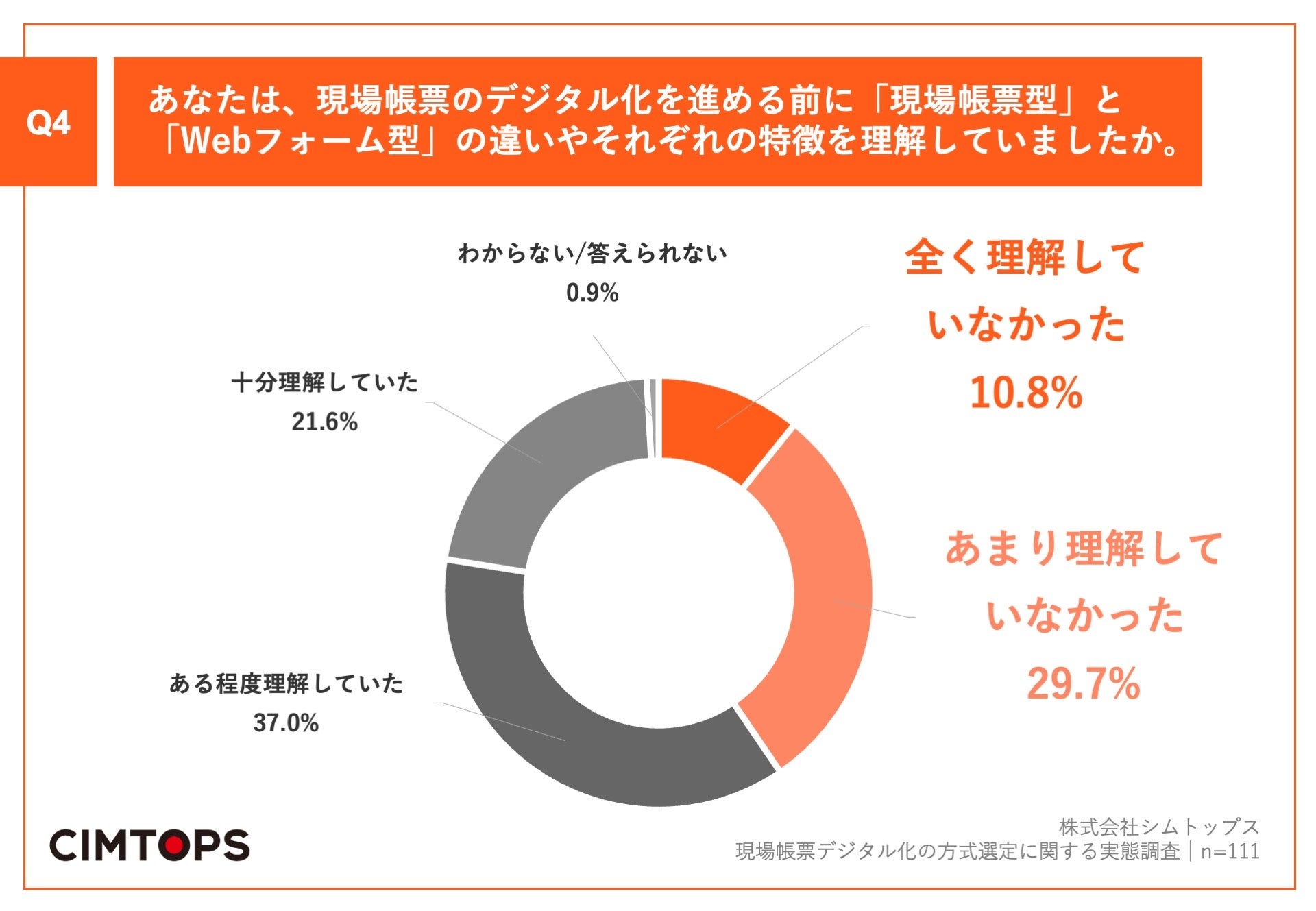 「Q4.あなたは、現場帳票のデジタル化を進める前に「現場帳票型」と「Webフォーム型」の違いやそれぞれの特徴を理解していましたか。」(n=111)と質問したところ、「全く理解していなかった」が10.8%、「あまり理解していなかった」が29.7%という回答となりました。