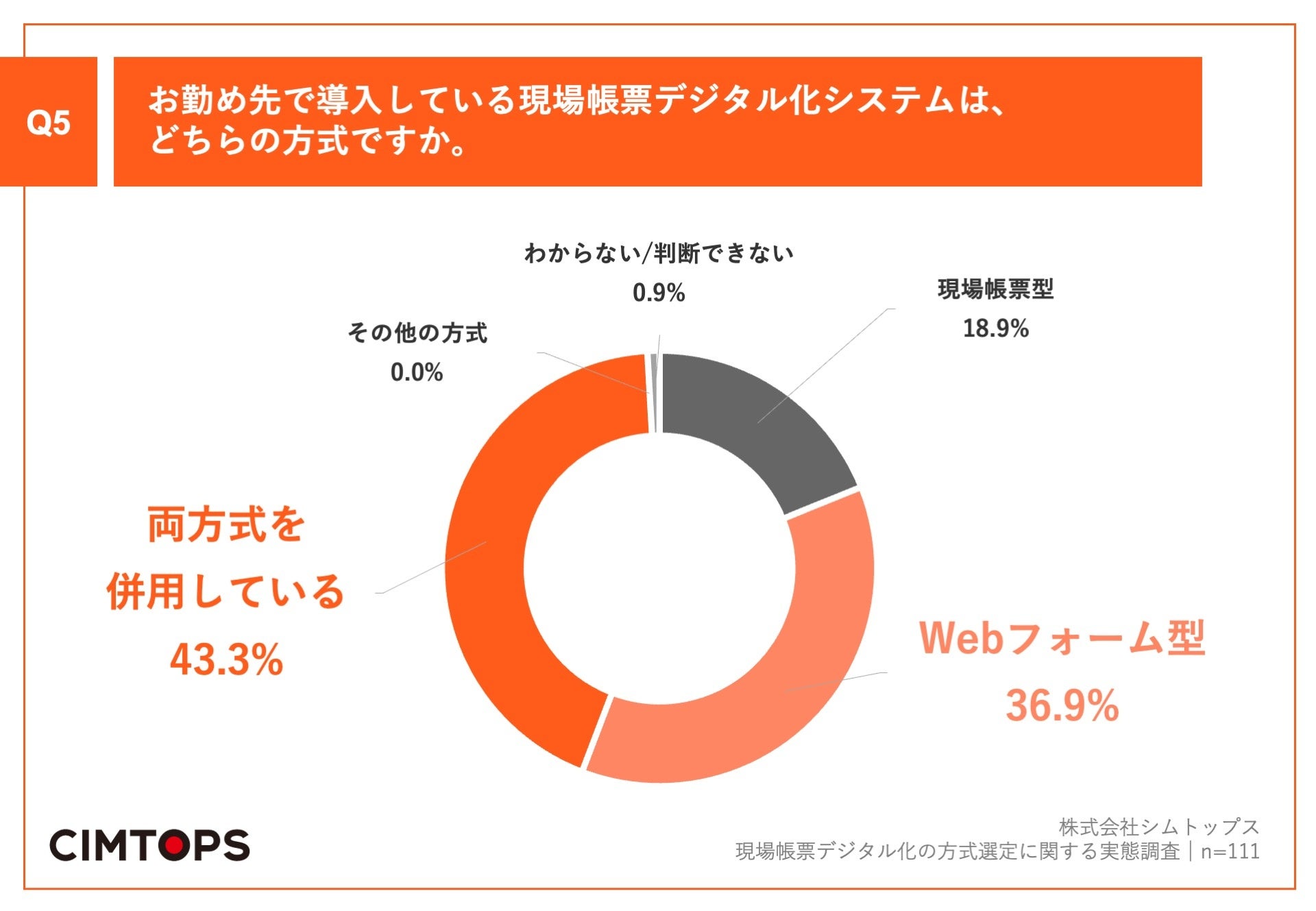 「Q5.お勤め先で導入している現場帳票デジタル化システムは、どちらの方式ですか。」(n=111)と質問したところ、「両方式を併用している」が43.3%、「Webフォーム型(1画面に少数項目のシンプルな入力画面)」が36.9%という回答となりました。