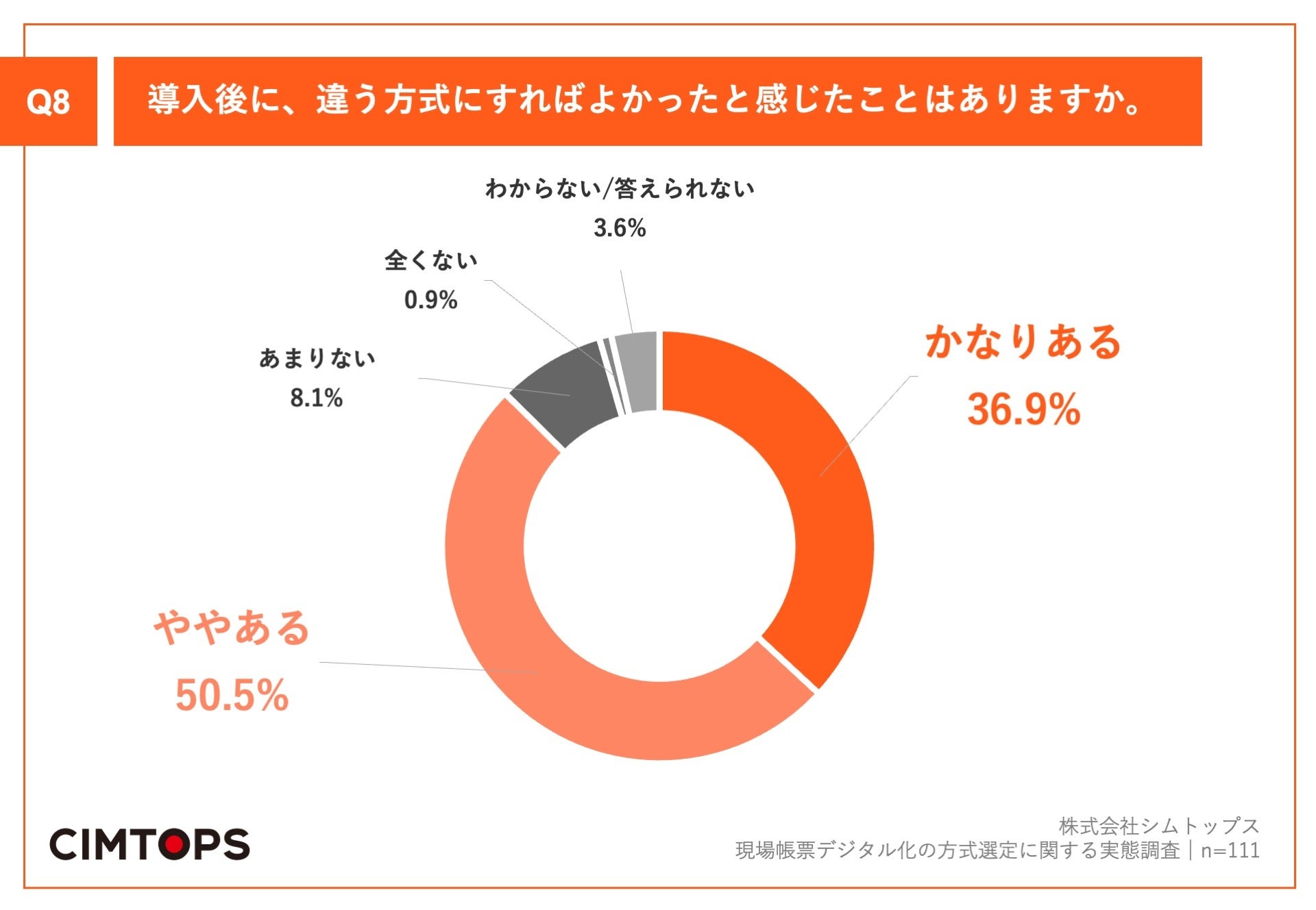「Q8.導入後に、違う方式にすればよかったと感じたことはありますか。」(n=111)と質問したところ、「かなりある」が36.9%、「ややある」が50.5%という回答となりました。