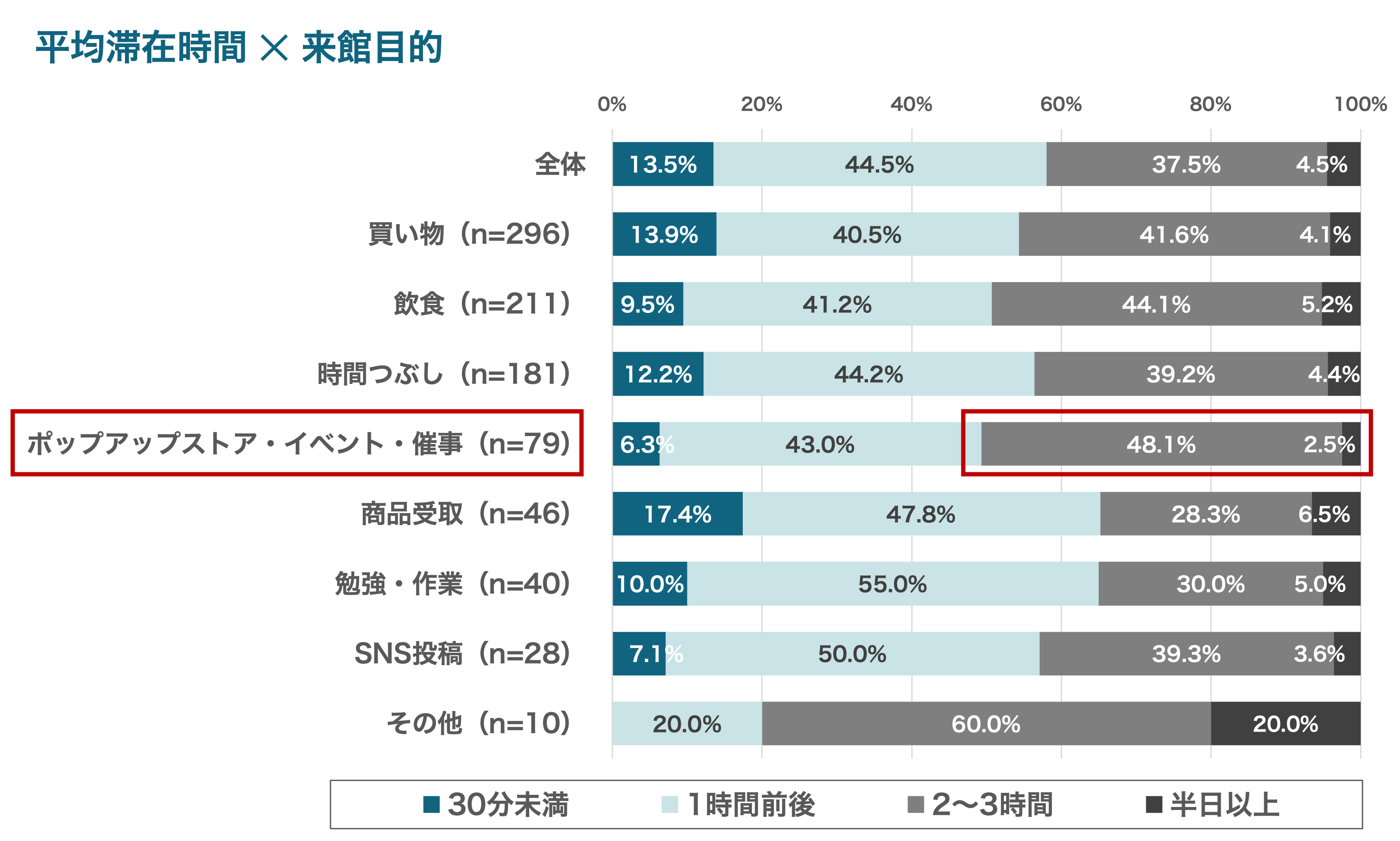 来館目的別に平均滞在時間をみると、「ポップアップストア・イベント・催事」は長期滞在の割合が全体平均と比較しても相対的に高く(“2~3時間”、“半日以上”の合算)、体験を軸に“ゆっくり過ごす”傾向が表れました。「買い物」は目的の幅が広いせいか、短時間での指名買いと長時間の買い回りの双方が混在する“二極型”の滞在パターンとなりました。