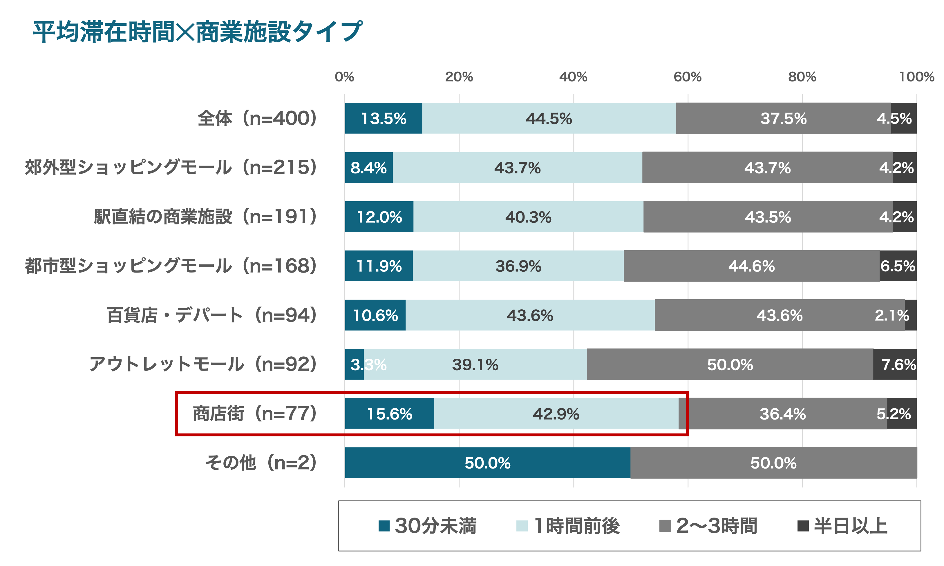 加えて館種別で平均滞在時間をみると、「商店街」は短時間利用(“30分未満”、“1時間前後”の合算)が58.5%と最も高く、“サクッと立ち寄る”利用が中心であることがわかりました。一方、「アウトレットモール」では“2~3時間”の滞在が相対的に高く、滞在を楽しむ目的地型の傾向が見られました。