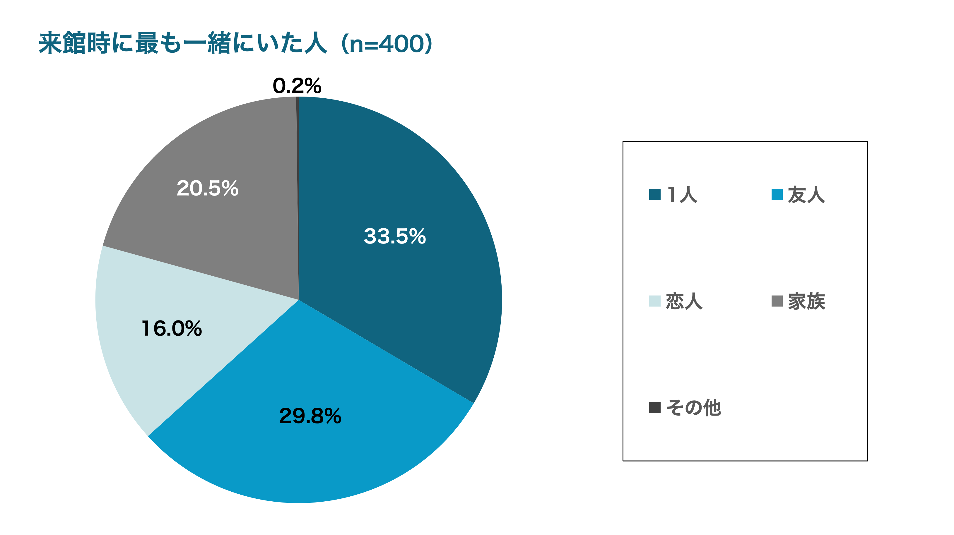 来館時、「友人」や「恋人」、「家族」など誰かしら同行者のいる割合が66.3%になり、単独来館の33.5%に比べ同伴来館が一定の比率を占める実態が確認できました。
