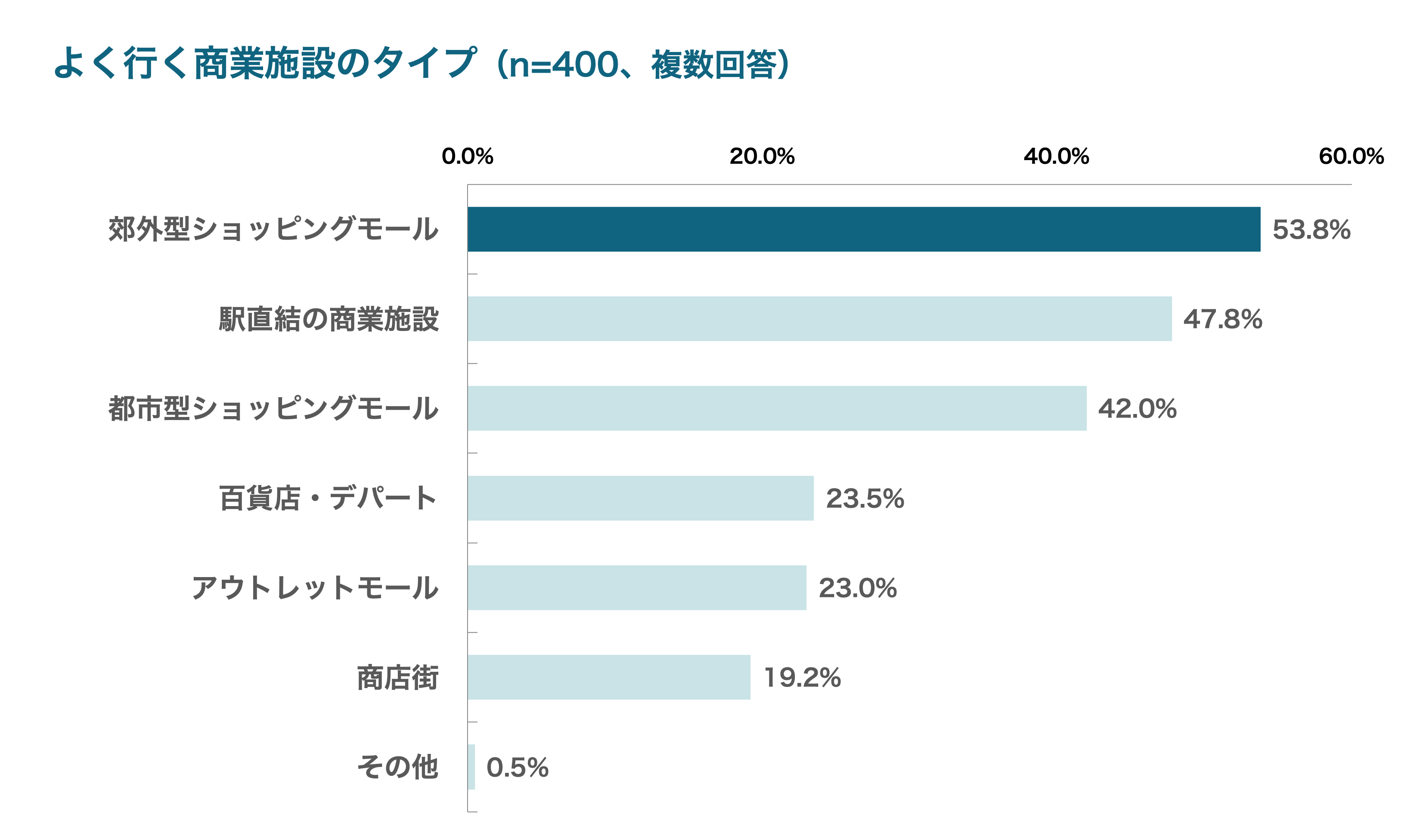 なお、よく行く商業施設のタイプでは、「郊外型ショッピングモール」や「駅直結の商業施設」が中心で、日常の買い物から休日のレジャーまで、シーンに応じて施設を使い分ける傾向が見られました。