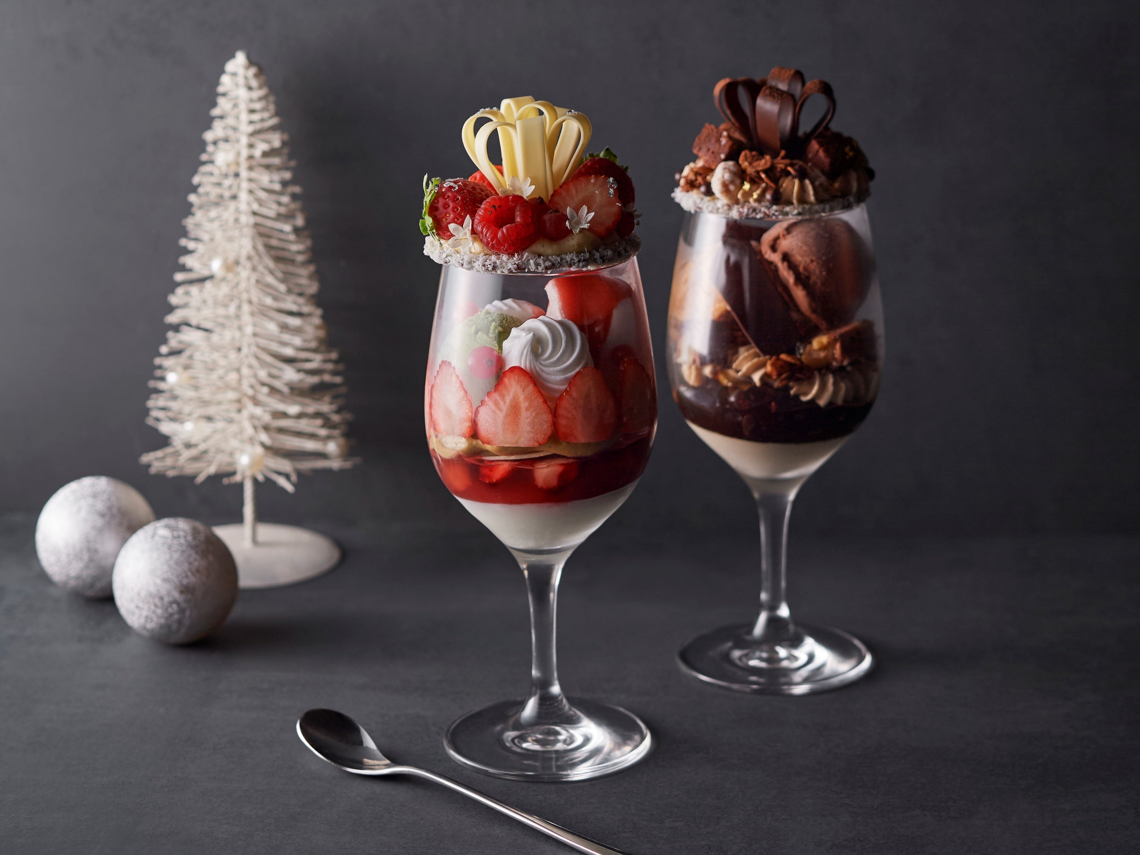 扉を開けると別世界が広がる雰囲気満点のカクテルバーで、クリスマスケーキに見立てた限定パフェをご用意しました。たっぷりのいちごにピスタチオを合わせたfraiseと、カカオソルベやコスタリカ産コーヒージュレ、プラリネクリームなどを重ねてオペラをイメージしたchocolatの2種。迷ったらぜひどちらも。