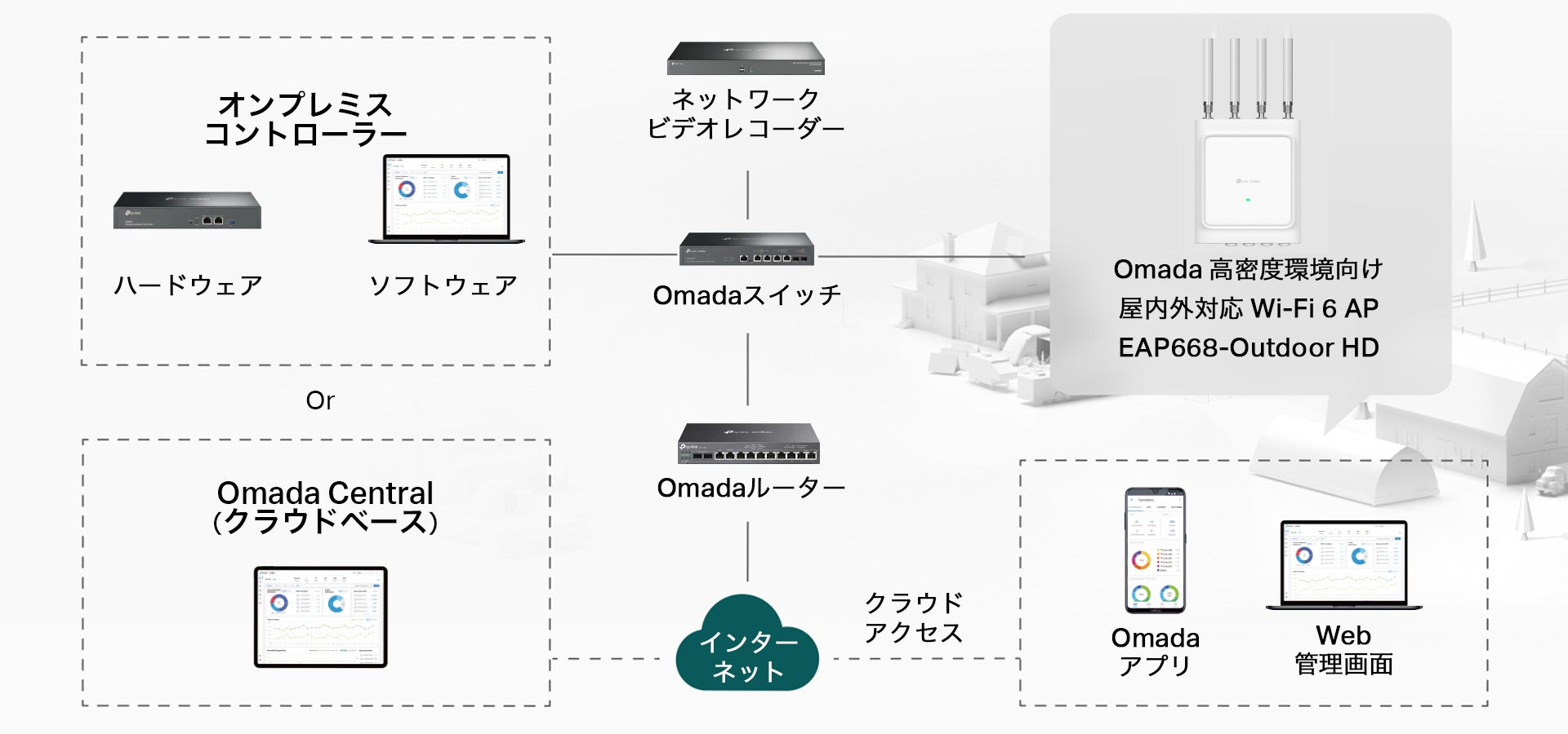 Omada SDN(Software Defined Networking)プラットフォームは、アクセスポイント・スイッチ・ルーター等のネットワークデバイスを統合し、100%集中型のクラウド管理を提供。1つの管理画面から全てを操作できる拡張性の高いネットワークを構築します。
