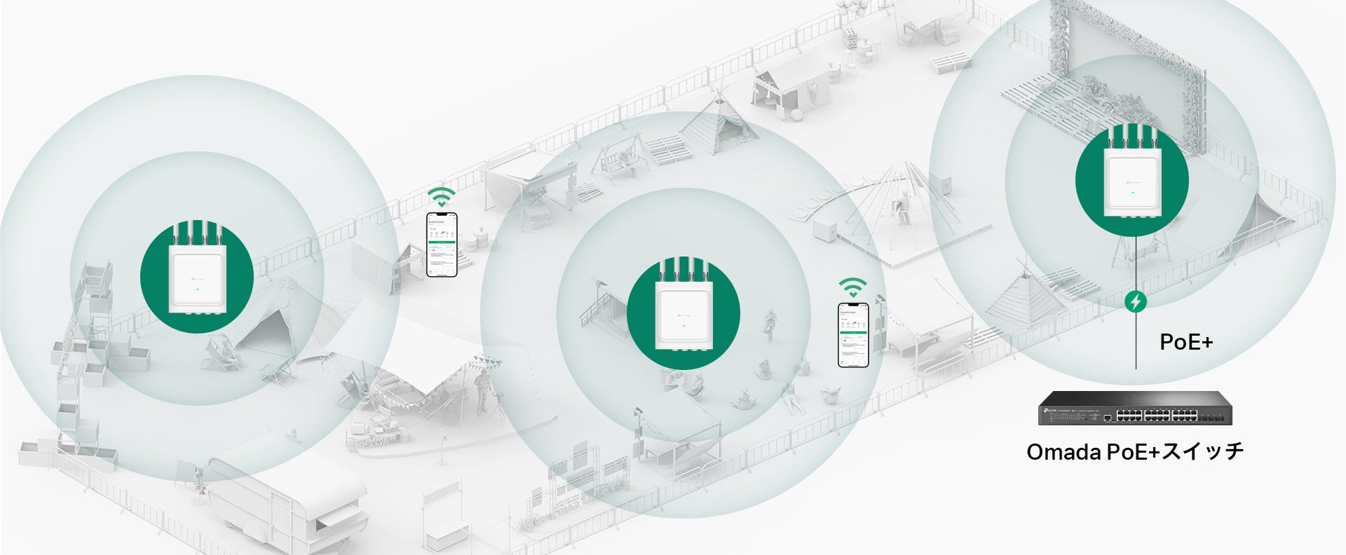 デバイスの接続先を最適なアクセスポイントに自動で切り替え可能なため、エリア内を歩き回っても途切れずシームレスに通信することができます。