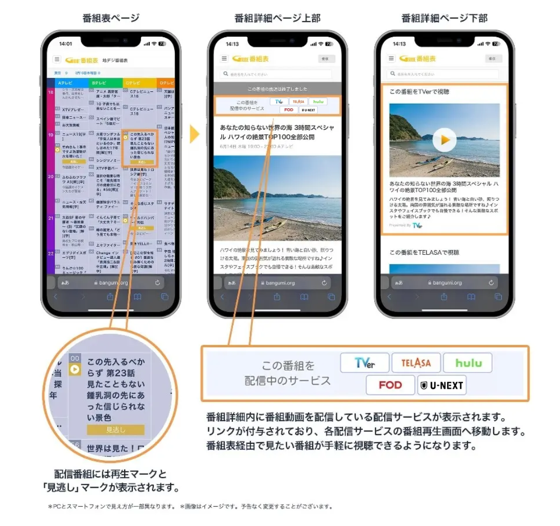「Gガイド」には、番組表上に見逃し配信サービスや有料配信サービスへのリンクを表示し、直接配信コンテンツにアクセスできる機能があります。