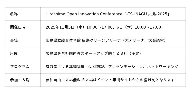 本イベントは、広島県が抱える産業構造の変化や労働人口減少などの課題に対し、県内企業と国内外の有望なスタートアップを「つなぎ」、オープンイノベーション(事業共創)を促進し、新たなビジネスや価値を創出することを目的としています。ものづくりを軸とする層の厚い産業群を持つ広島において、新事業開発、ビジネスモデル変革の起爆剤となることが期待されています。