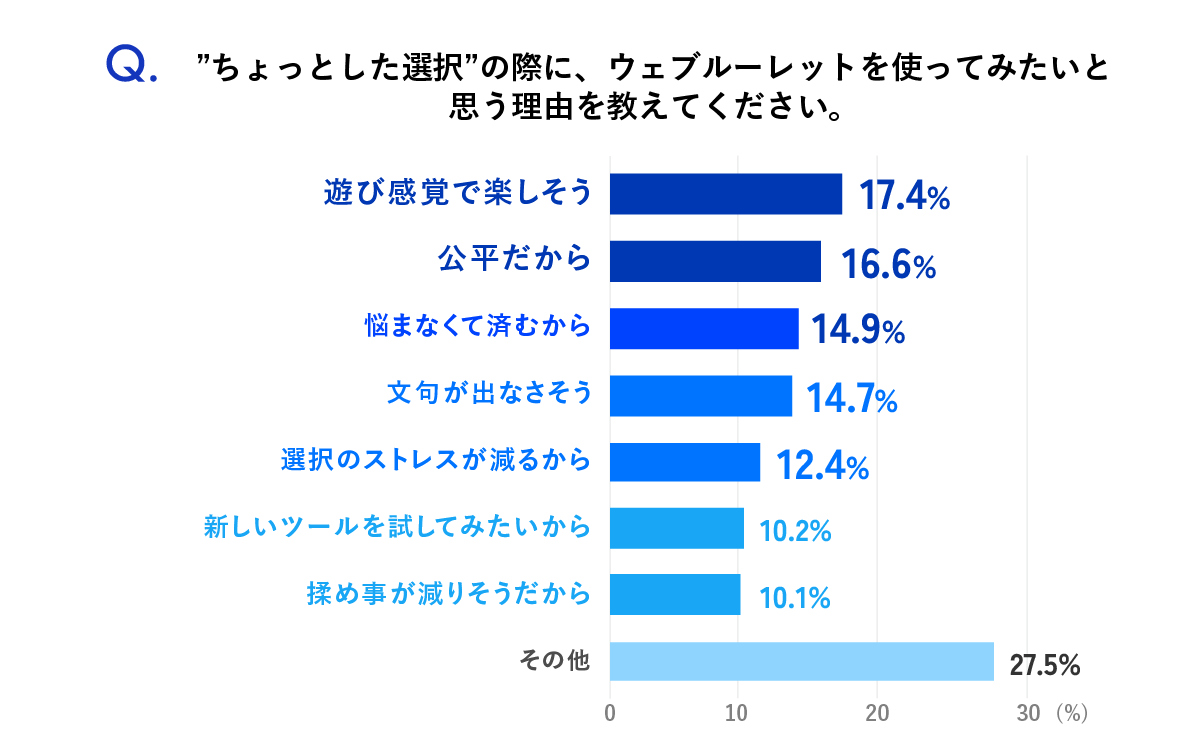 こうしたストレスを解消する手段として、「Webルーレット」に選択を任せることについて調査したところ、84.1%が使ってみたいと回答しました。理由としては、「遊び感覚で楽しめる」「公平に決められる」「悩まずに済む」といった回答が多数でした。