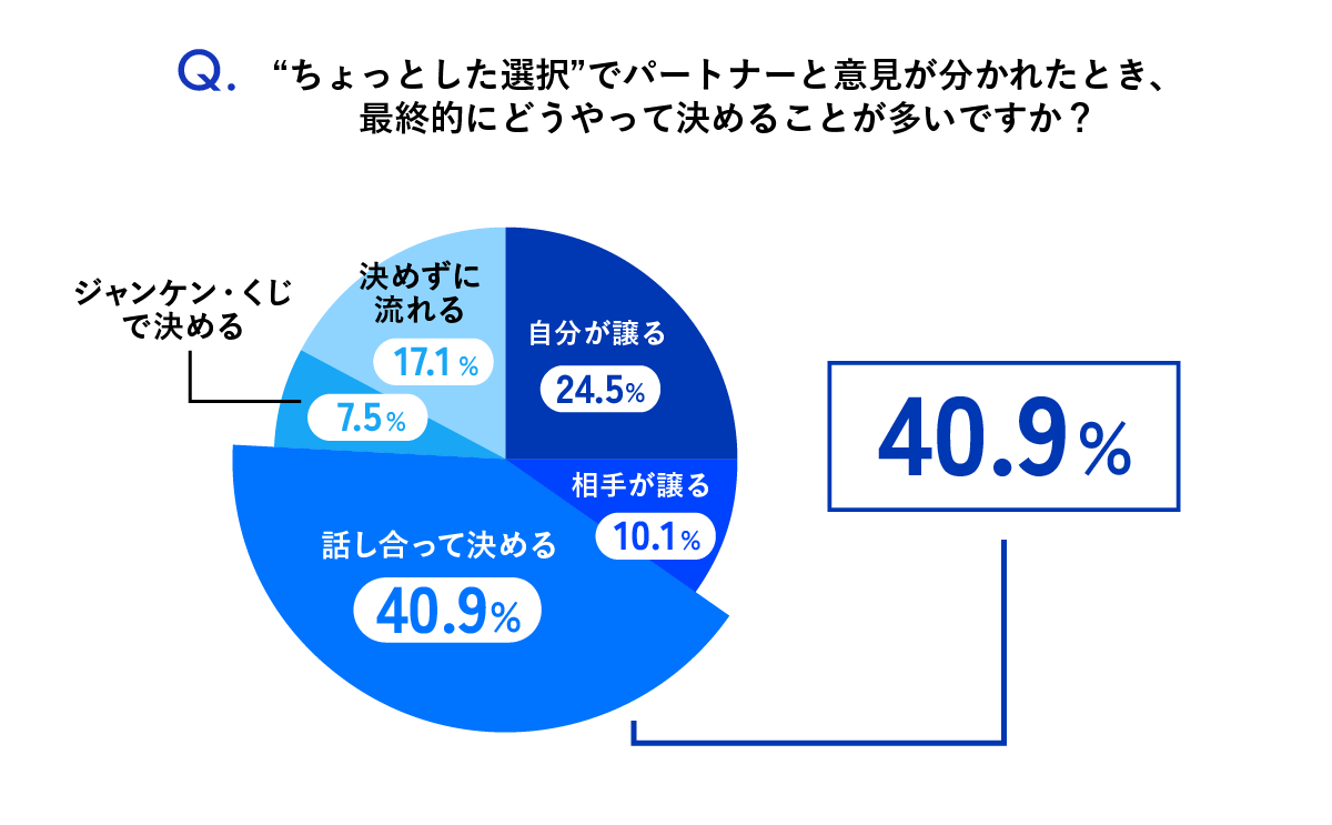 「“ちょっとした選択”でパートナーと意見が分かれたとき、最終的にどうやって決めることが多いか」の質問に対し、最も多かったのは「話し合って決める」で40.9%でした。続いて「自分が譲る」が24.5%、「決めずに流れる」が17.1%、「相手が譲る」が10.1%、「ジャンケン・くじ」が7.5%という結果になりました。話し合いや譲り合い、時には運任せで決めるなど、相手への配慮や関係性を大切にする姿勢がうかがえます。