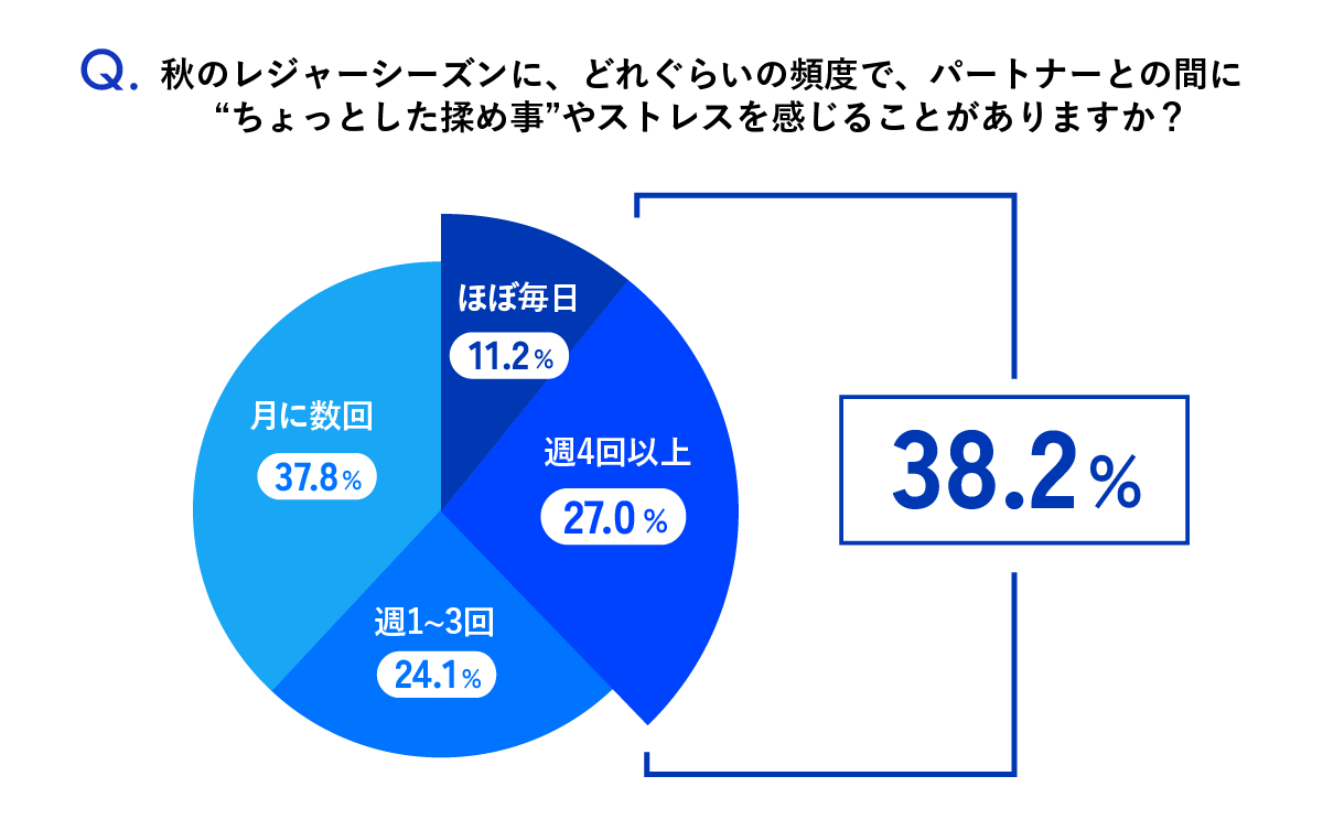 「秋のレジャーシーズンに、パートナーとのちょっとした選択で揉めたりストレスを感じることはありますか?」という質問に対し、約半数(46.6%)が「よくある・時々ある」と回答しました。さらに、意見の対立頻度を聞いたところ、「よくある・時々ある」と回答した人の約4割(38.2%)が、「週4日以上・ほぼ毎日」と答えており、頻繁に意見の対立が起こっていることが明らかになりました。
