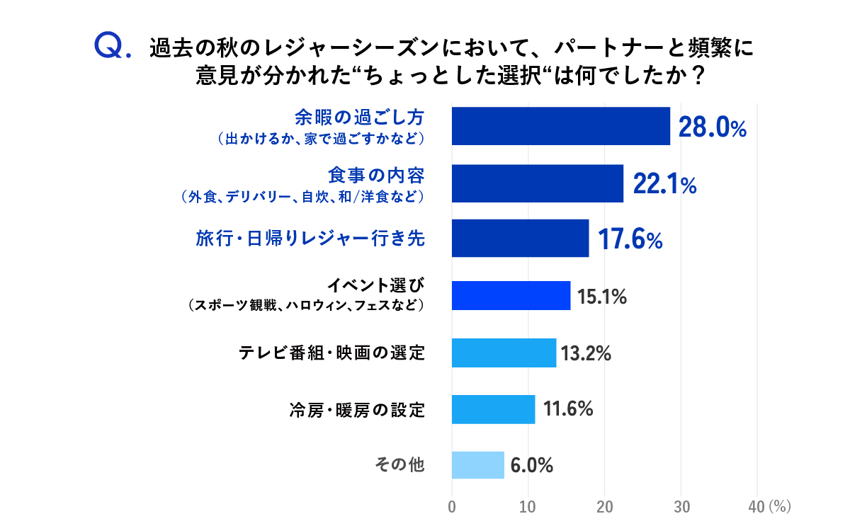 次に、「過去の秋のレジャーシーズンにおいて、パートナーとの間で頻繁に意見が分かれた“ちょっとした選択”」について質問したところ、1位は「余暇の過ごし方(外出か家で過ごすかなど)」(28.0%)、2位は「食事の内容(外食か自炊か、和食か洋食かなど)」(22.1%)、3位は「旅行やレジャーの行き先」(17.6%)でした。
