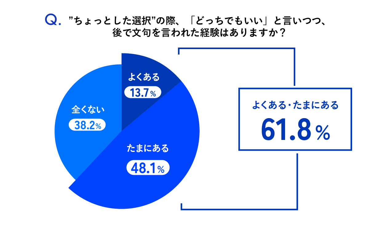 - 「ちょっとした選択」の際「『どっちでもいい』と言いつつ、後で文句を言われた経験がある」カップルは61.8%