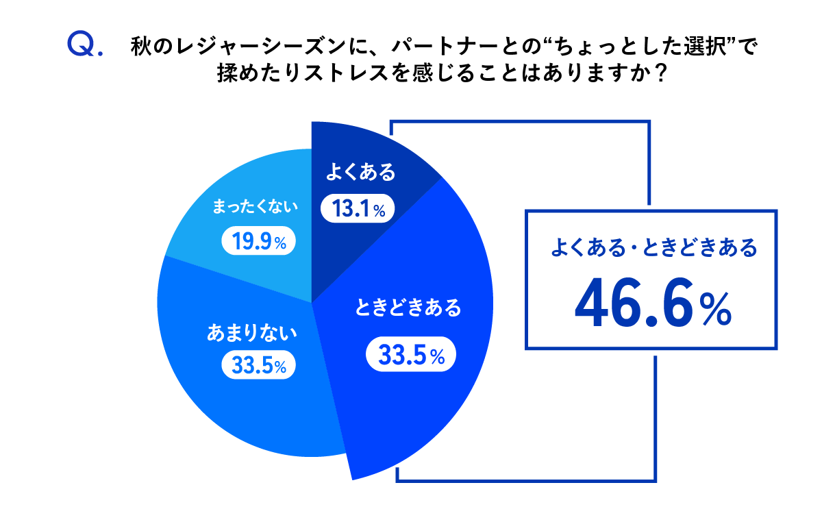 - 約半数(46.6%)のカップルが、秋のレジャーシーズンに「ちょっとした選択」でストレスを感じた経験があると回答。