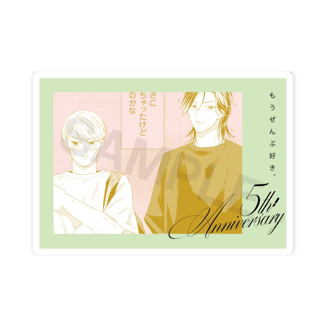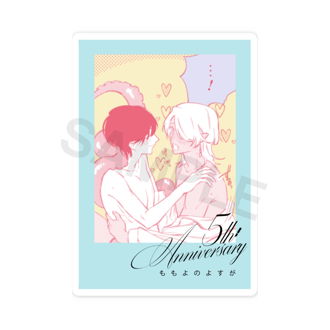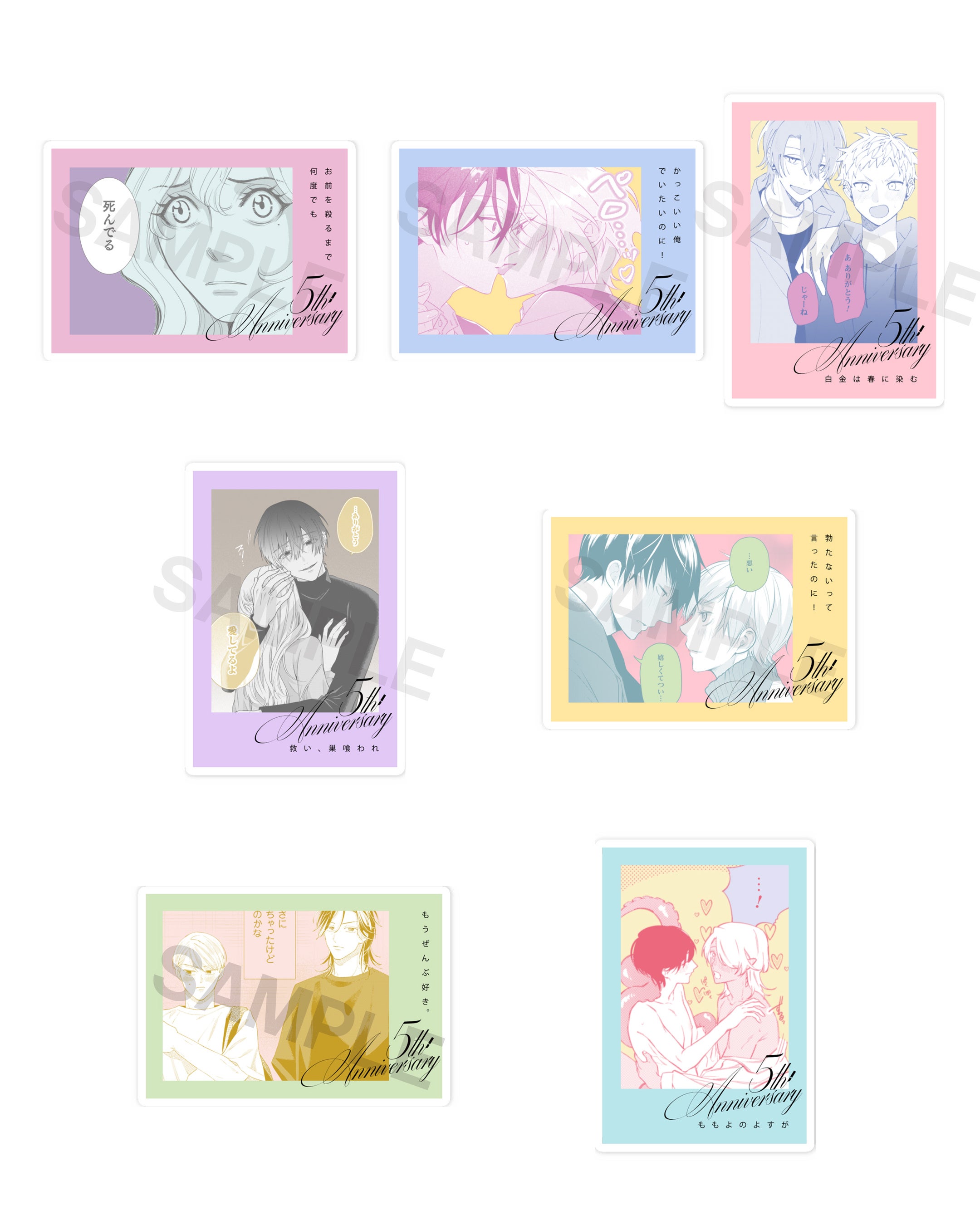 『お前を殺るまで何度でも』『かっこいい俺でいたいのに!』『白金は春に染む』『救い、巣喰われ』『勃たないって言ったのに!』『もうぜんぶ好き。』『ももよのよすが』の、描き下ろしイラストを堪能できるL版サイズのネットプリントを期間限定で配布します。