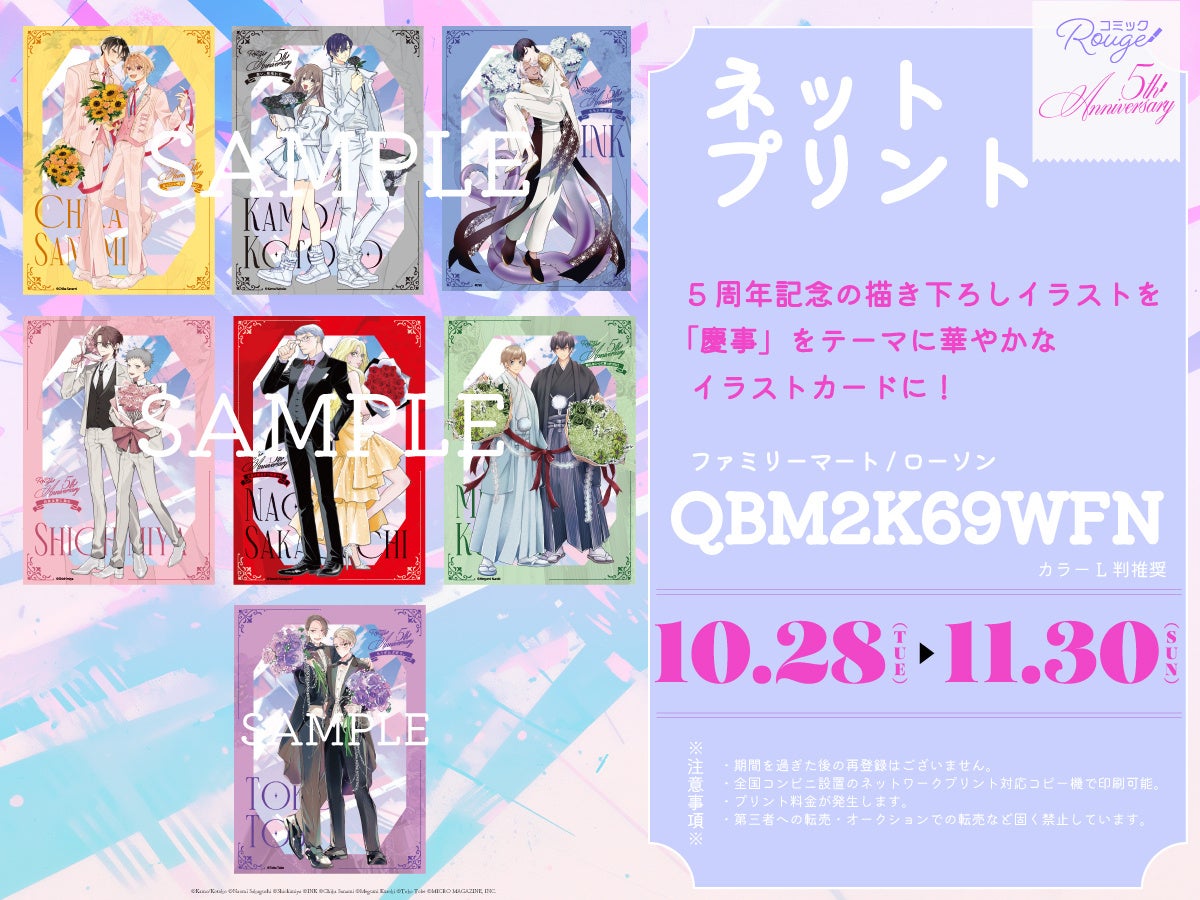 コミックRouge 5周年を記念して、10月28日より期間限定で描き下ろしイラストを起用した記念グッズの受注販売します。さらにネットプリントで描き下ろしイラストの配布を行います。