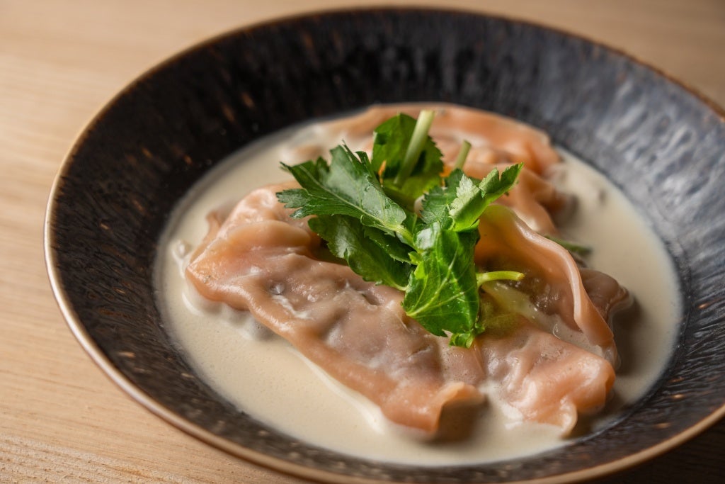 鴨の上質な脂を活かした出汁で味わう「しゃぶしゃぶ」。こちらの”相棒葱”には京野菜の代表格として知られる「九条葱」を合わせています。