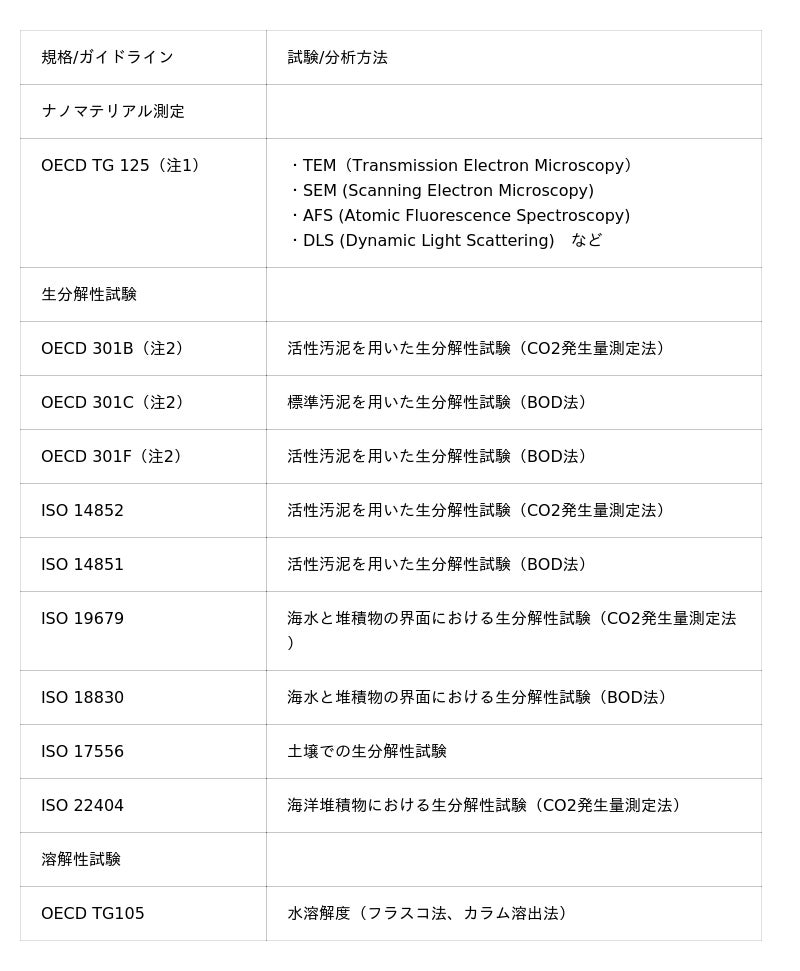 - OECD TG 125に準拠したナノマテリアル粒子寸法分析・レポート発行(注1)