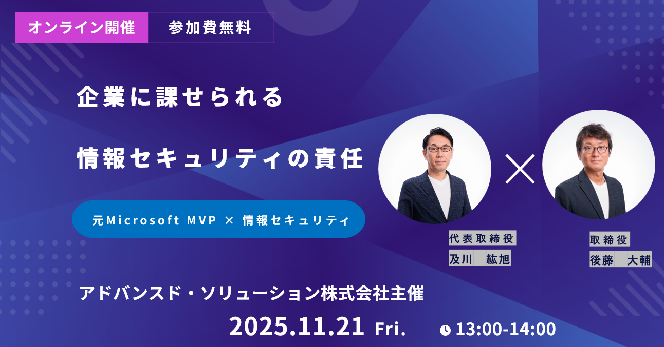 アドバンスド・ソリューション株式会社(本社:東京都中央区、代表取締役:及川紘旭、以下、ADS)は11/21(金)13時より情報セキュリティに関する特別無料セミナーを開催します。