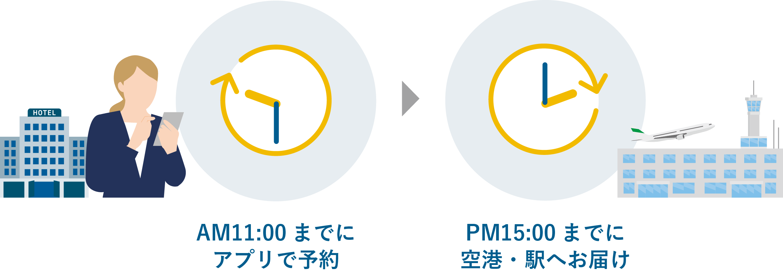 当日預け入れた手荷物をその日のうちに空港・駅までお届けいたします。集荷日当日午前11時までのご予約・お手荷物のお預け入れで、当日午後15時頃までに空港・駅へお届けします。お帰りの日も最後まで身軽に、観光やショッピングをお楽しみいただけます。