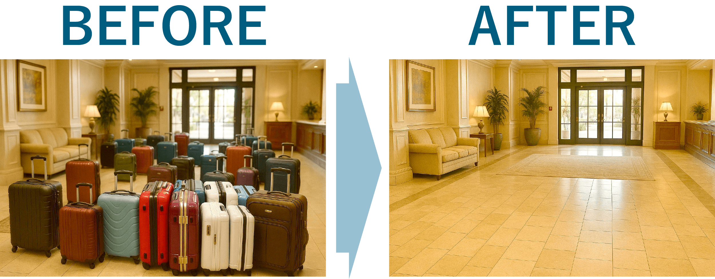 広さに限りがある施設の場合、これまでは一時預かりした手荷物はロビーに並べて管理するしかないため、ホテル施設内のロビーが手荷物で圧迫されてしまうという課題がありました。当サービスを利用すると、午前11時~ドライバーが順次集荷に伺いますので、チェックイン前には手荷物がなくなりスッキリした環境でお客様をお出迎えすることができます。ロビーの手荷物がなくなることで、本来のホテル施設の景観を損ないません。
