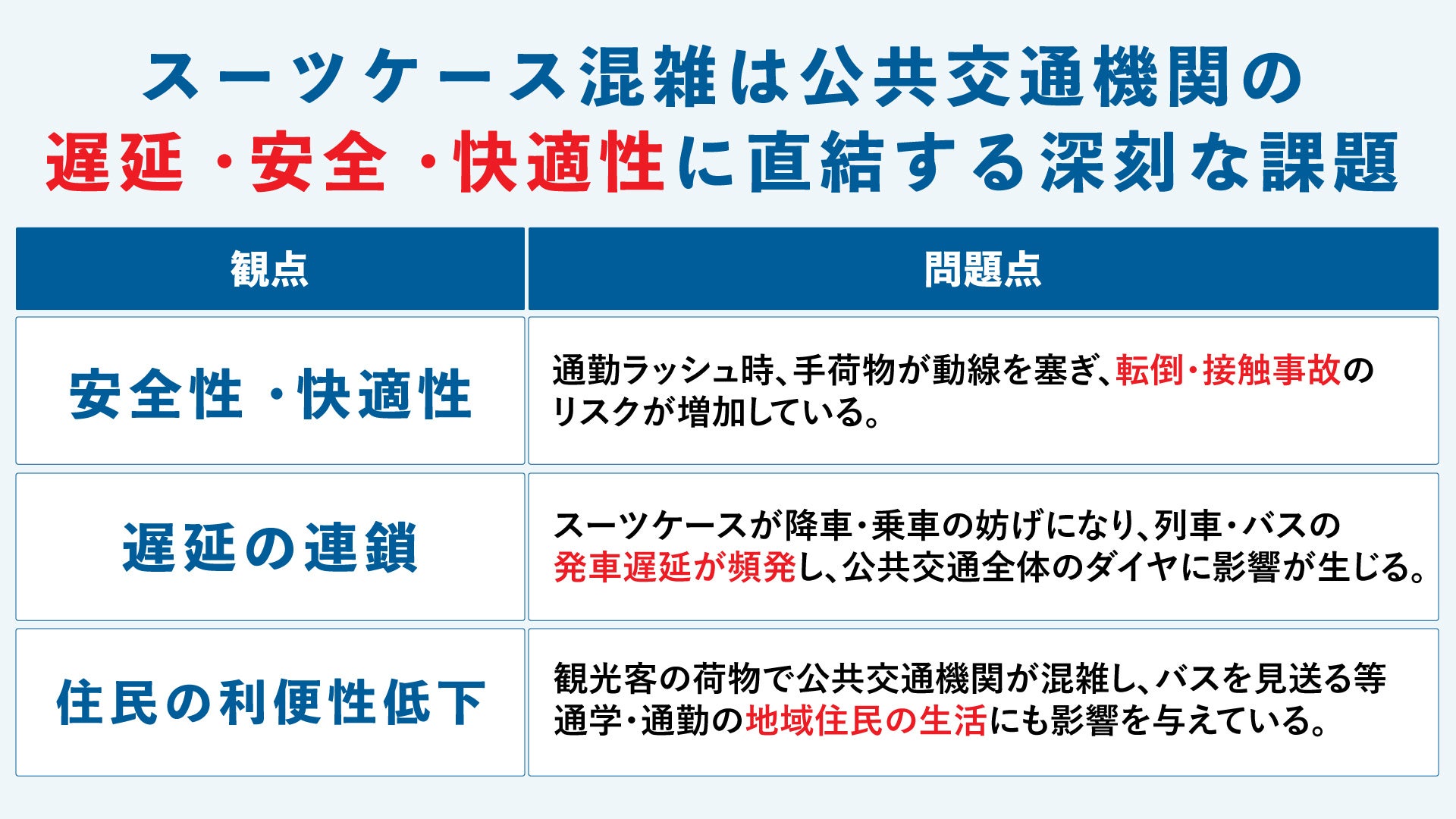 インバウンド公害と称される、大量のスーツケーストラブル!円安の影響で訪日観光客が急増し、公共交通機関や商業施設ではスーツケースによる混雑や放置などのトラブルが相次いでいます。(例:新幹線の予約制の荷物スペースの無断使用、公共交通機関内が観光客の大きなスーツケースによる混雑など)「APEX24」は、オーバーツーリズムによる社会課題の解決を目指し、より良い観光体験のための「手ぶら観光」を推進します。