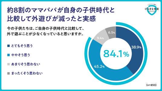 2.菌離れの一つの原因と言われており、また子供が病気にかかりやすい理由の一つにあがっていた「外遊びの機会減少」について質問した結果、約8割(84.1%)のママ・パパが自分の子供時代と比較して外遊びが減ったと回答しました。その原因として、「スマートフォンの普及により動画やゲームで遊ぶことが多くなった」(72.9%)、「公園の減少などで遊べる場所が減少したから」(44.8%)、が主な原因として実感していることがわかりました。