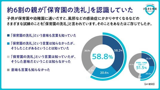 1.「保育園の洗礼」という言葉の認知率は約6割(58.8%)と半数を越え、多くのママ・パパが「保育園の洗礼」の存在を認識していることがわかりました。