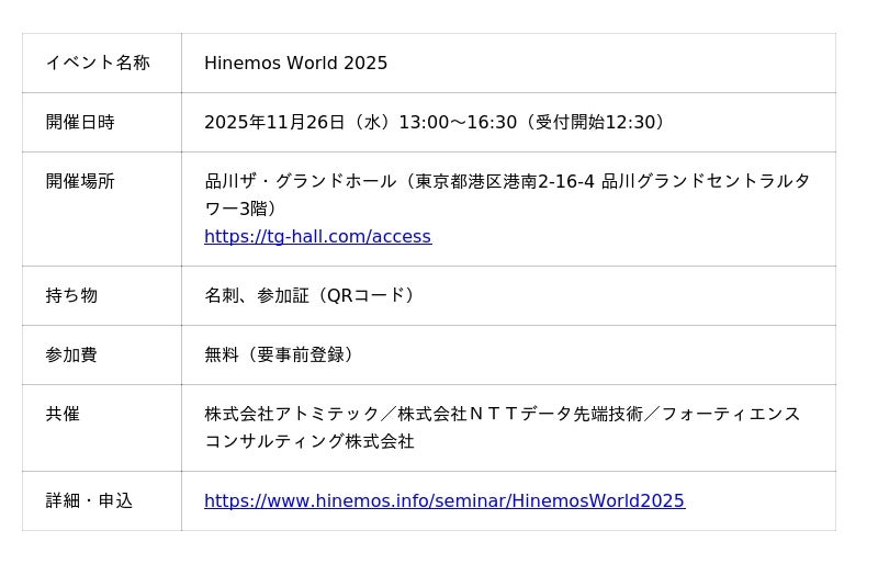 株式会社NTTデータ先端技術の協力会社として、統合運用管理ソフトウェア「Hinemos(ヒネモス)」の開発・営業・プロモーションを行う株式会社アトミテック(本社:東京都港区、代表取締役社長:中西 康貴)は、株式会社NTTデータ先端技術、フォーティエンスコンサルティング株式会社と共催で、「Hinemos World 2025」を、2025年11月26日(水)13:00より、品川ザ・グランドホール(東京都)にて開催することをお知らせいたします。
