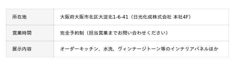 インテリア・オーダーキッチンの製造・販売を手がける日光化成株式会社(本社:大阪市北区)は、このたび本社社屋4階を全面改装し、「大阪ショールーム」を新たに開設いたしました。