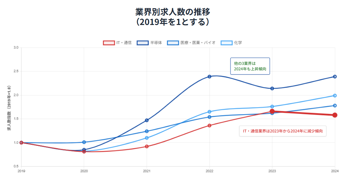 また、株式会社リクルートが2025年3月10日に公表した「2024年度 転職市場の動向(下半期)」では、IT・通信業界の求人数が数年来初めて減少する一方、半導体・医薬・化学など研究開発領域の求人は増加しており、産業構造の転換が進んでいることが示されています。
