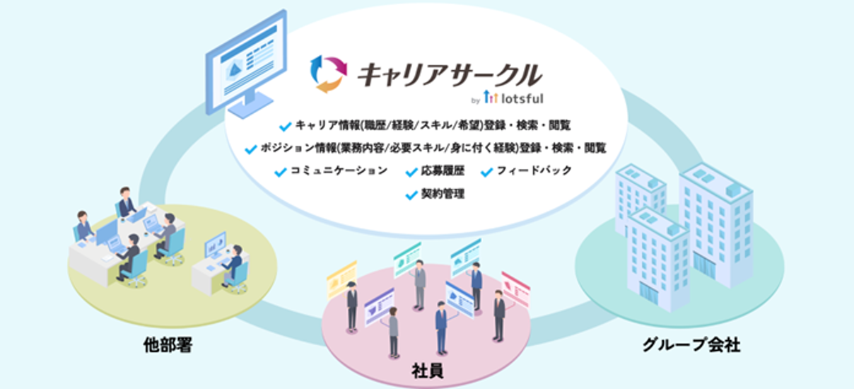 「キャリアサークル」は、『lotsful』が提供する企業人事担当者向けキャリア支援プラットフォームです。パーソルグループで独自開発した社内向けシステムをベースに、社内・グループ内の異動や副業に特化した機能を提供し、公募型異動や企業内副業の求人情報や選考状況の一括管理、応募、体験の可視化をシームレスに実現します。3万件の副業マッチング実績をもつ専門コンサルタントが制度設計や風土醸成、社内求人の要件定義やコンテンツの企画に伴走支援します。
