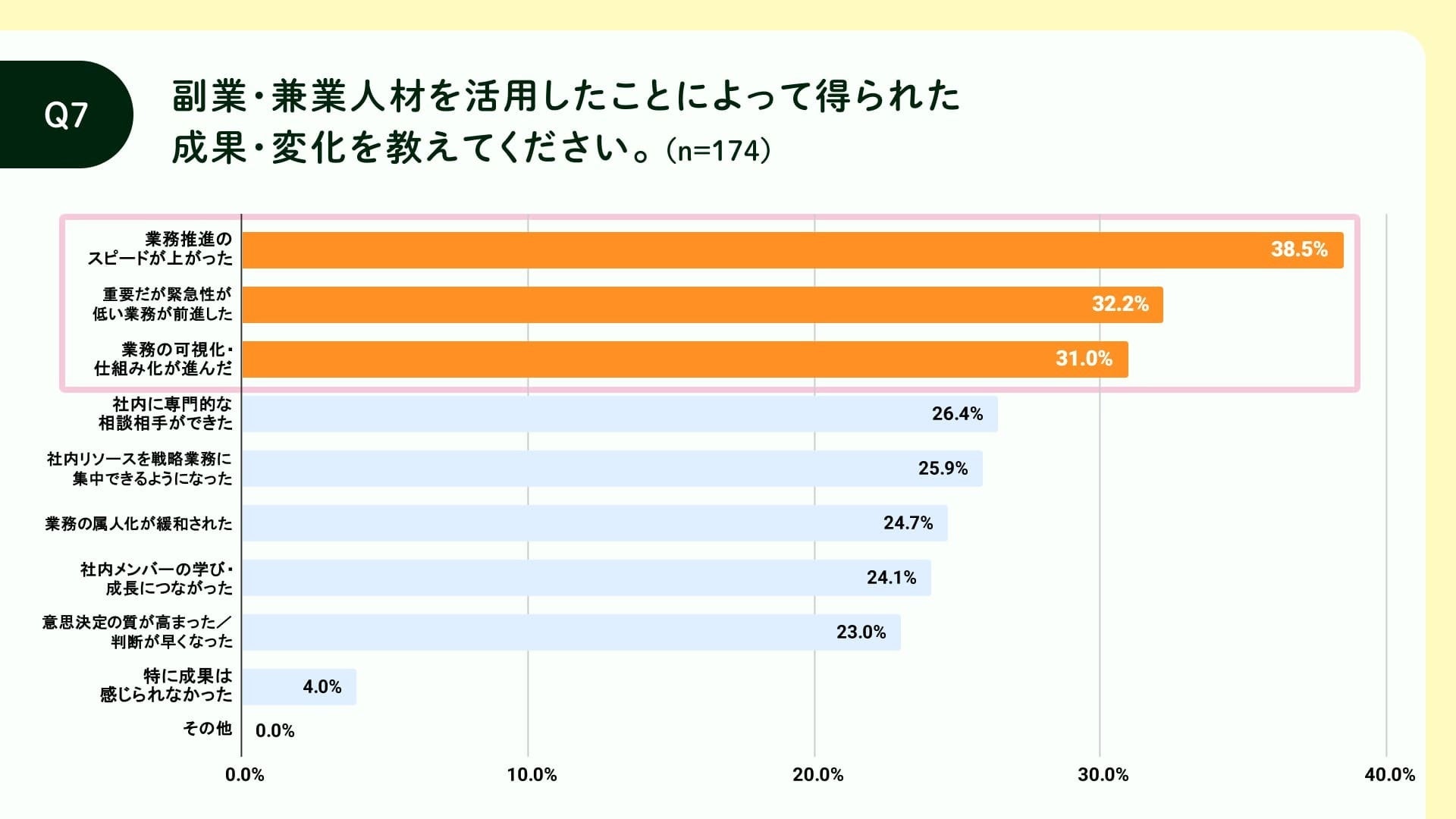 副業・兼業人材を活用して得られた成果を尋ねたところ、「業務推進のスピードアップ(38.5%)」が最多で、次いで「停滞していた重要業務の進展(32.2%)」、「業務の可視化・仕組み化(31.0%)」が挙がりました。全体の82.7%が「成果を実感した」と回答しており、副業活用が単なるリソース補完にとどまらず、組織にプラスの変化を生み出していることが明らかになりました。