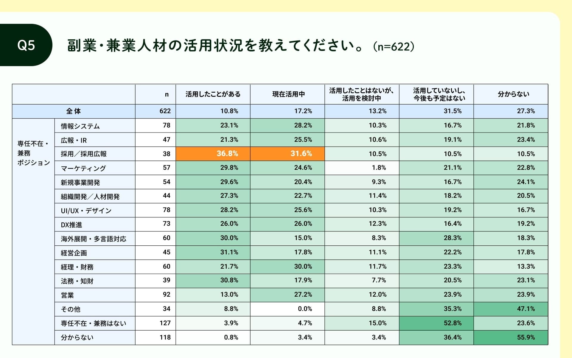 副業・兼業人材の活用割合は、「情報システム(25.3%)」、「UI/UX・デザイン(24.7%)」、「マーケティング(23.0%)」が上位を占めました。いずれも変化が速く専門性が求められる分野であり、今回の結果は、不足スキルの補完にとどまらず、副業人材を通じて最新の知見や多様な発想を取り入れる動きが進んでいることを示しています。