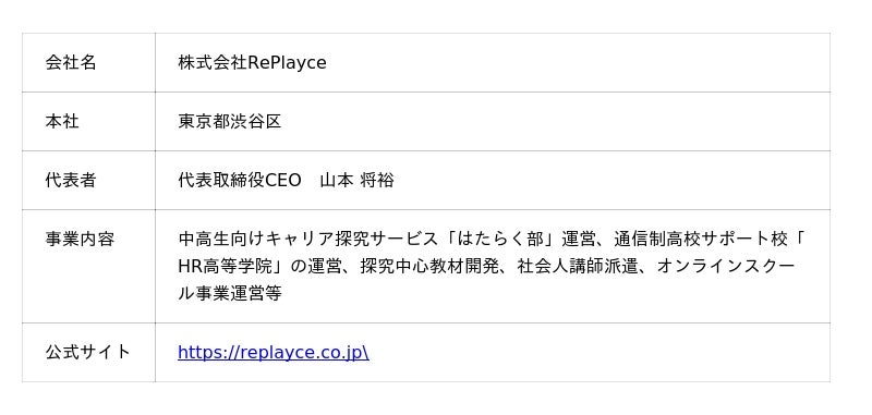 株式会社RePlayceは、株式会社NTTドコモの中で起案された中高生向けキャリア探求サービス「はたらく部」がスピンアウトして設立されたスタートアップ企業です。