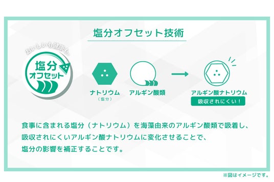 トイメディカルが開発した「塩分オフセット技術」は、海藻由来の食物繊維アルギン酸類を用い、食事中の塩分(ナトリウム)を胃の中で吸着し、吸収しにくい形に変えて、最終的に便として排出するという新しいメカニズムに基づいています。これにより、味を変えることなく、実質的に“減塩”の効果を得ることが可能です。またカリウムを使用していないため、カリウム制限のある方にも安心してご使用頂くことができます。