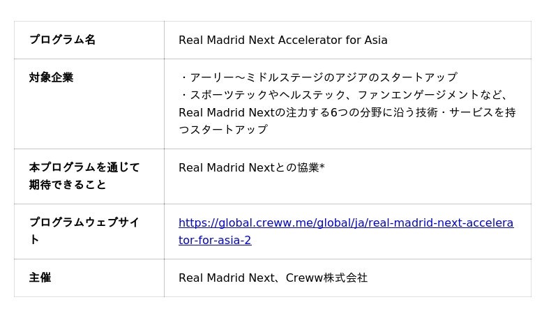 URL:https://global.creww.me/global/ja/real-madrid-next-accelerator-for-asia-2(多言語対応サイト)