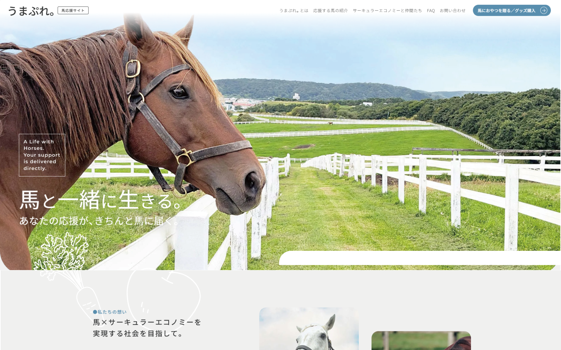 日本の農業では、年間およそ50万トン以上の青果物が「規格外」という理由で市場に出回らず廃棄されています農林水産省調べ)。一方、現役・引退競走馬の飼養には、十分な栄養管理が不可欠であり、特に嗜好性の高いにんじん等は食欲増進などの人気の補助食材です。「うまぷれ」は、これらの課題を“馬と人(ファン)の架け橋”として解決し、ファンの想いを持続可能な支援に変えるプラットフォームとして誕生しました。