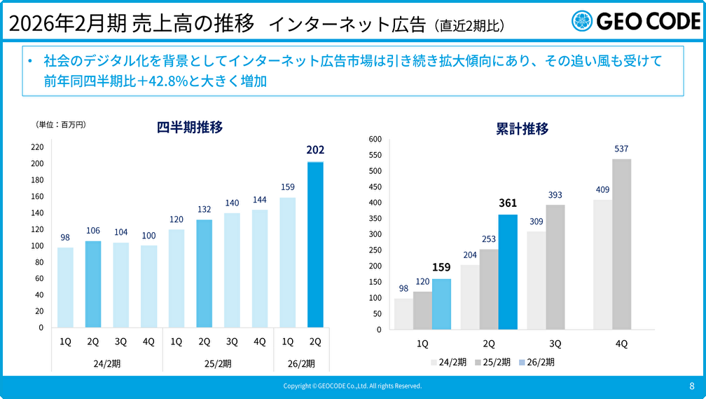 2024年のインターネット広告費の国内市場規模は3兆6,517億円(前年比109.6%)となっており、社会のデジタル化を背景に市場の拡大が継続しています。当社のインターネット広告事業も引き続き好調に推移し、直近2026年2月期 第2四半期の売上高は、前年同四半期比+42.8%と大きく伸長しています。