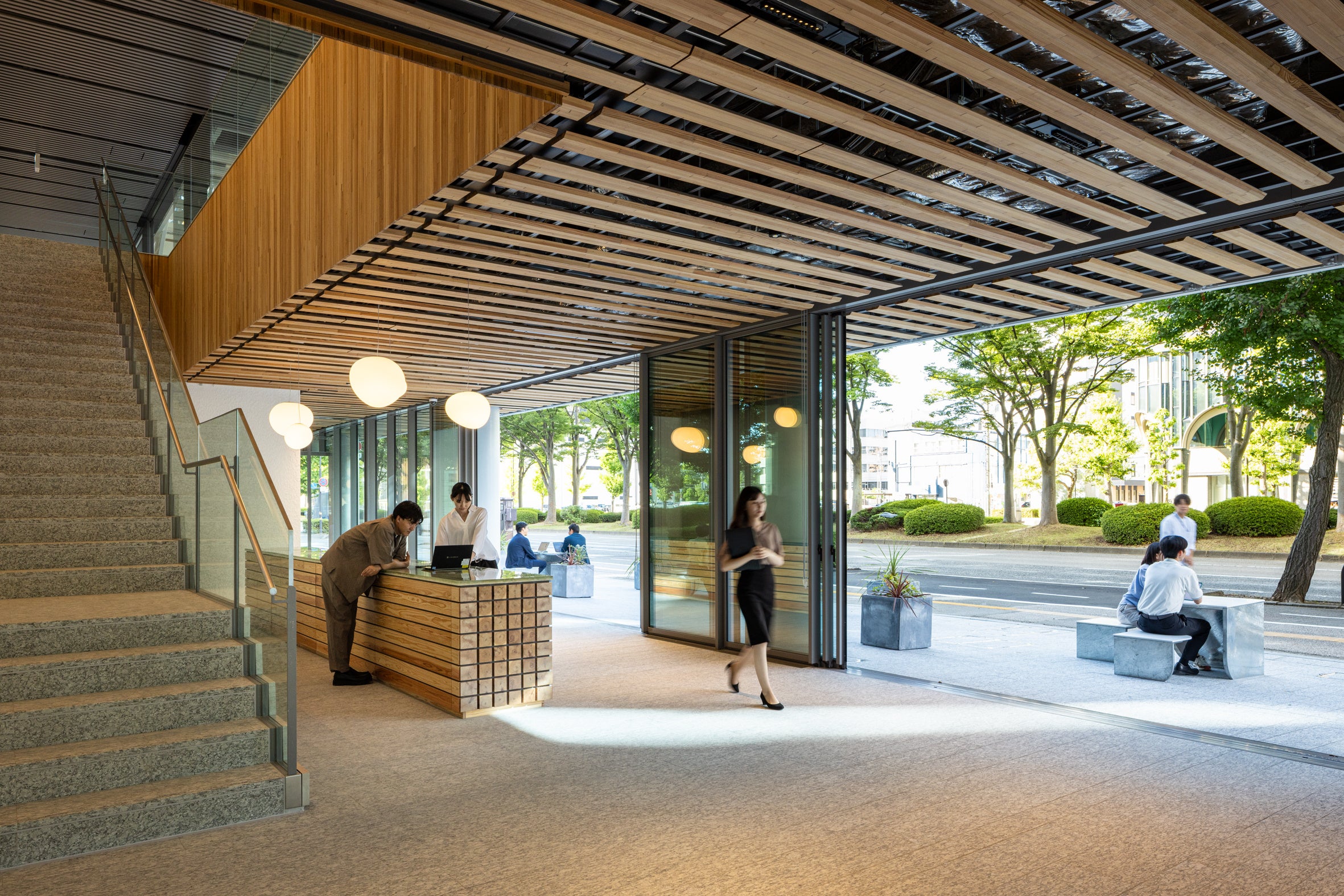 今日、人びとが集まり、つながる場として、オフィス/オフィスビルに求められる役割は大きな変化を迎えています。Hirooka Terraceでは、働く場所の開放性と流動性を高め、協創拠点として、多様な利用者が交差し、新たな革新を生み出すワークプレイスの構築を目指すとともに、これを内部にとどめず、外部の自然を感じられる環境として実現することが新たな可能性になると考えました。金沢の気候と呼応し、内外・半外部の共用空間を積極的に取り入れた、本地域で初となる各種の取り組みを紹介します。