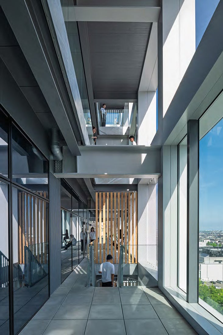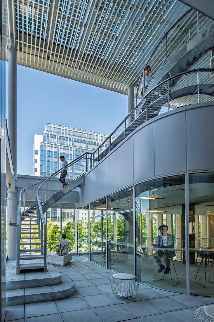 オフィス北面(けやき大通り側)に配置されたテラスは、水平方向に加えて階段や吹き抜けを介して上下方向にも連続。テナントごとの専有区画とせず、全テナントが自由に活用できる大らかな共用空間です。一般的なオフィスビルでは、テナント同士の出会いや交流は内部廊下でのみ生じることとなりますが、本建物では、この半外部のテラスによって窓の外側の空間も「表」とし、建物内外で賑わいを生み出す構成としています。