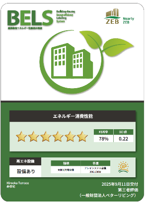 「BELS」最高評価ならびに「Nearly ZEB」取得。エネルギー削減率は78%を達成。