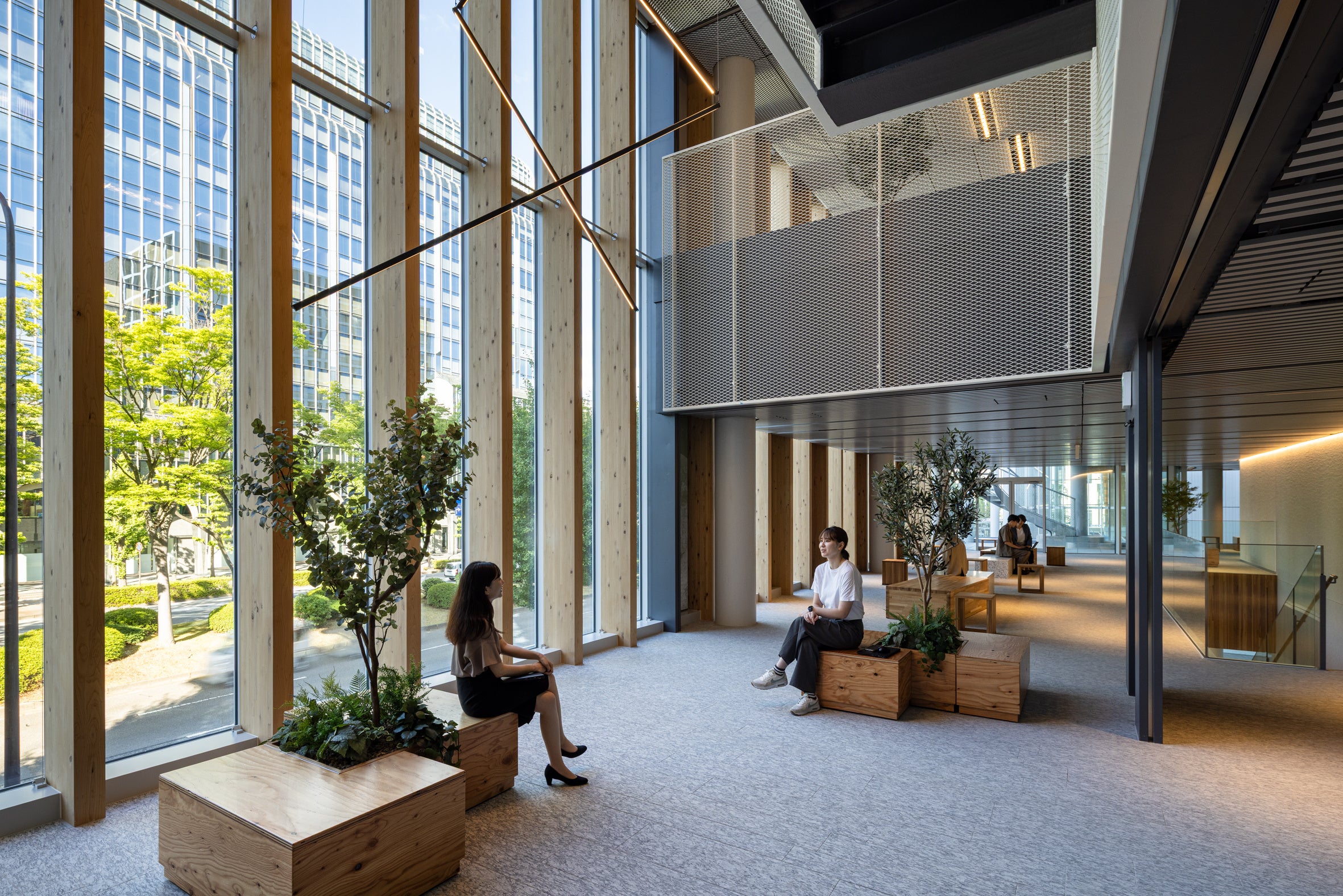 2階ラウンジ。方立に石川県産材の能登ヒバを採用し、正面のけやき大通りの緑と一体になる木質空間を目指しました。