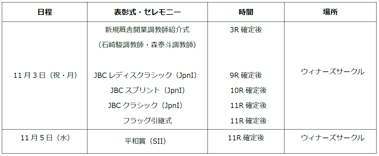 「JBCクラシック(JpnI)」「JBCスプリント(JpnI)」「JBCレディスクラシック(JpnI)」と国内最高峰の3競走が集結。迫力ある頂上決戦をぜひご堪能ください。また、11月5日(水)には未来のダート界を担う2歳馬たちが大舞台に挑む伝統の重賞「農林水産大臣賞典 平和賞(SII)」を実施いたします。若駒たちの力強い走りにもご期待ください。