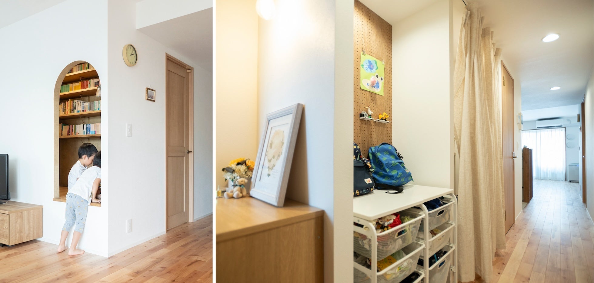 秘密基地気分で楽しめるヌック型の読書スペース(左)。現在は片付け収納、将来は勉強机が置ける廊下のフリースペース(右)