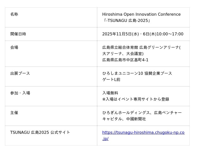 【ひろしまユニコーン10採択企業】広島県内の企業とスタートアップ企業のマッチングイベント「TSUNAGU 広島 2025」に出展します